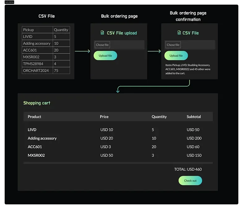 For businesses that order hundreds of items at a time, it can be very time consuming to find each of the items to be bought, fill up the cart and then complete the order.